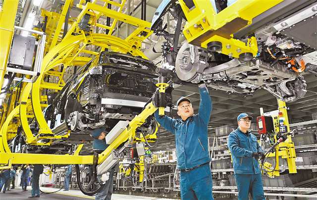 一季度我市新能源汽车产业继续保持较快增长,产量达18.71万辆、同比增长13.3%。图为位于两江新区的赛力斯汽车超级工厂,工人在底盘线作业。记者 张锦辉 摄/视觉重庆